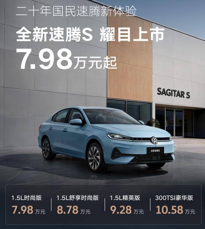 全新速腾 S 定位入门级 A + 级家轿,官方指导价 7.98 万 - 10.58 万元,共推出 4 款车型,以超高性价比抢占 10 万级家用车市场。外观延续德系经典设计,新增专属丹宁蓝车色,更显年轻时尚,配备 12.9 英寸中控大屏、AI 智能座舱、电子怀挡,科技感拉满。动力提供 1.5T Evo2 发动机匹配 7 速 DSG 与 1.5L 自吸发动机匹配 6AT 双动力选择,兼顾动力性能与燃油经济性,满足城市通勤、家庭出行需求。速腾累计销量超 450 万辆,是唯一畅销 20 年仍月销破 2 万的燃油家轿,全新速腾 S 进一步夯实国民家轿标杆地位。