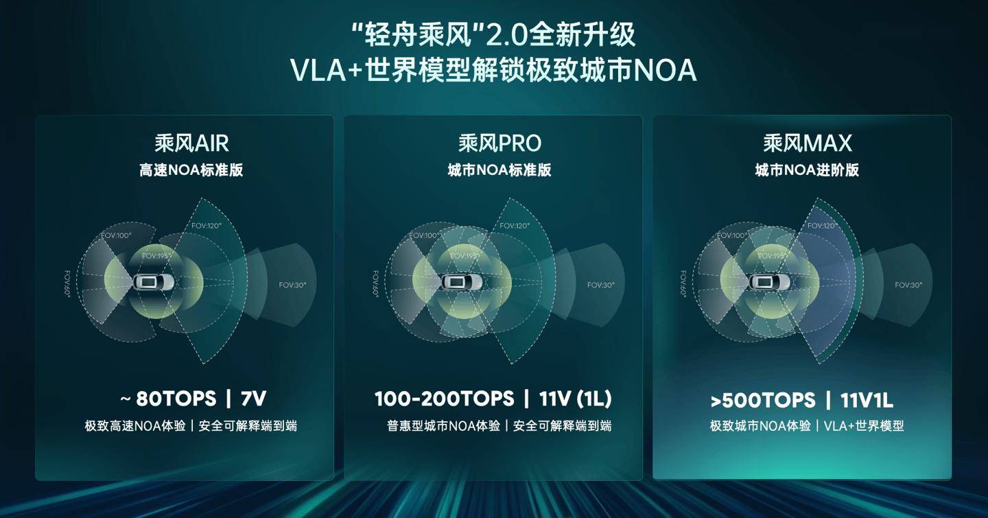 目前,轻舟智航的智能驾驶方案已覆盖从8万元到40余万元的多个价位区间,满足不同消费群体的需求。其“轻舟乘风”三级产品矩阵已全面落地:乘风AIR方案以约80TOPS算力和7V传感器配置,支持高速NOA功能;乘风PRO方案采用100至200TOPS算力及11V或11V1L传感器组合,实现城市NOA功能;乘风MAX方案则凭借超过500TOPS算力和11V1L配置,深度融合VLA与世界模型,提供高阶城市NOA服务。