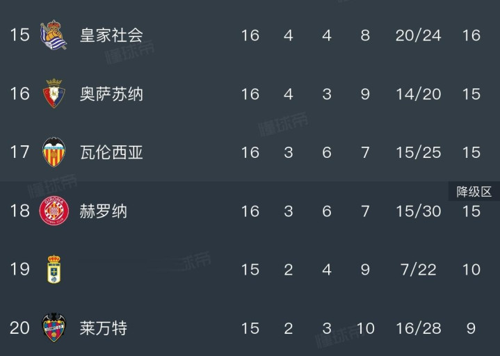 而在降级区方面,3支球队本轮依旧无法逃脱泥潭,他们分别是积15分的赫罗纳、积10分的皇家奥维耶多和排名垫底的莱万特。不过好在对于他们而言,和排名靠前的球队分差不大,而且联赛还有很多场比赛,他们也还有很多的机会。