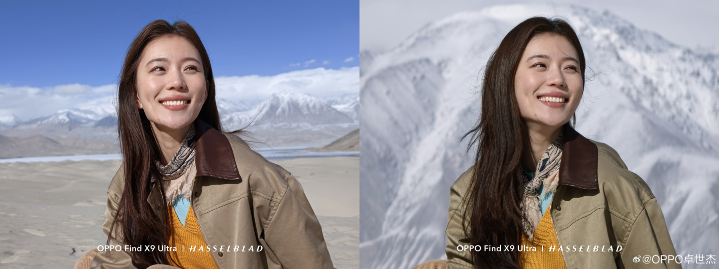 除演唱会外,旅拍是 10 倍光变发挥价值的另一大核心场景。普通手机镜头在旅拍时,往往难以平衡人物与背景的比例,难以拍出背景与人物同为主角的“杂志感”大片。卓世杰表示,Find X9 Ultra 的 10 倍光变镜头巧妙利用了长焦的光学空间压缩感,能够将千米之外的雪山、森林或城市天际线视觉上“压缩”至人物身后,营造出极强的空间张力。在此光学特性的基础上,配合哈苏自然色彩与 LUMO 超清人像算法,人物的发丝微光与皮肤纹理得以真实还原。卓世杰强调,这种基于光学物理特性的拍摄,摒弃了生硬的算法感,让每一张照片都充满电影般的氛围与质感。